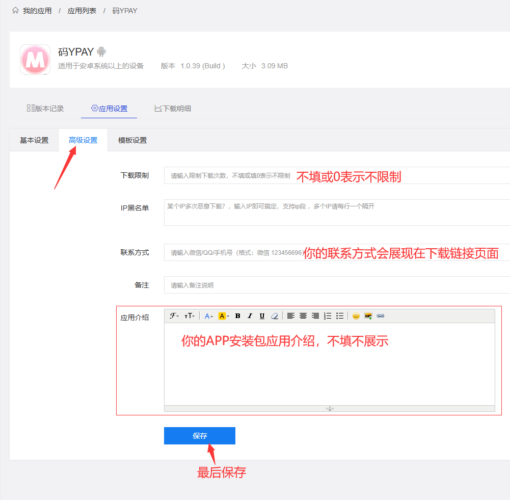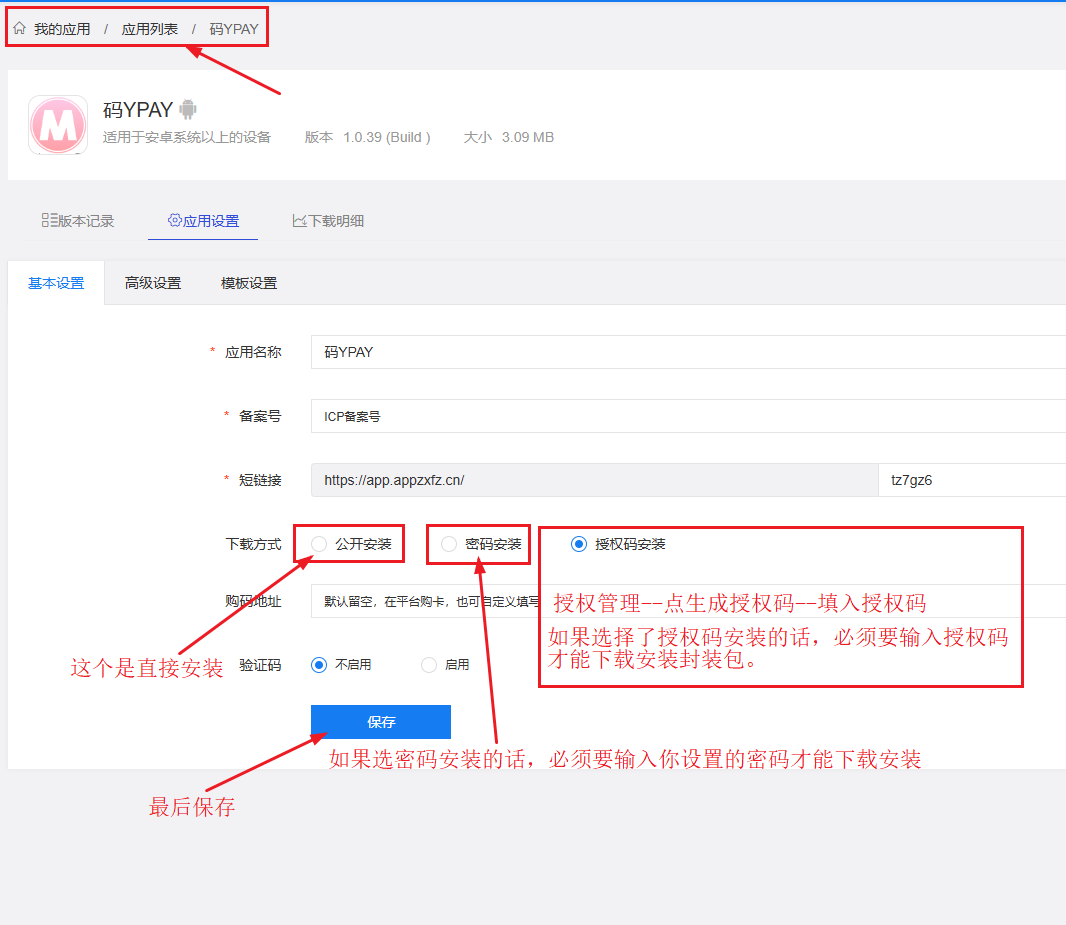 点应用列表--得到你的安装包下载链接和二维码,如果你同时有安卓和苹果安装包的下载链接,可以合并成一个下载链接地址