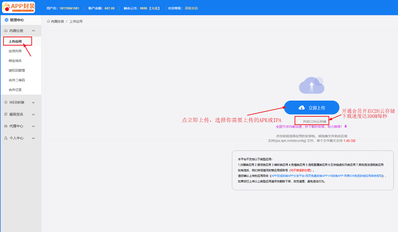 管理中心--点内测分发--上传应用--上传你的应用安装包。