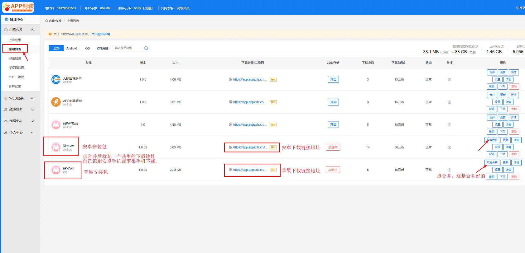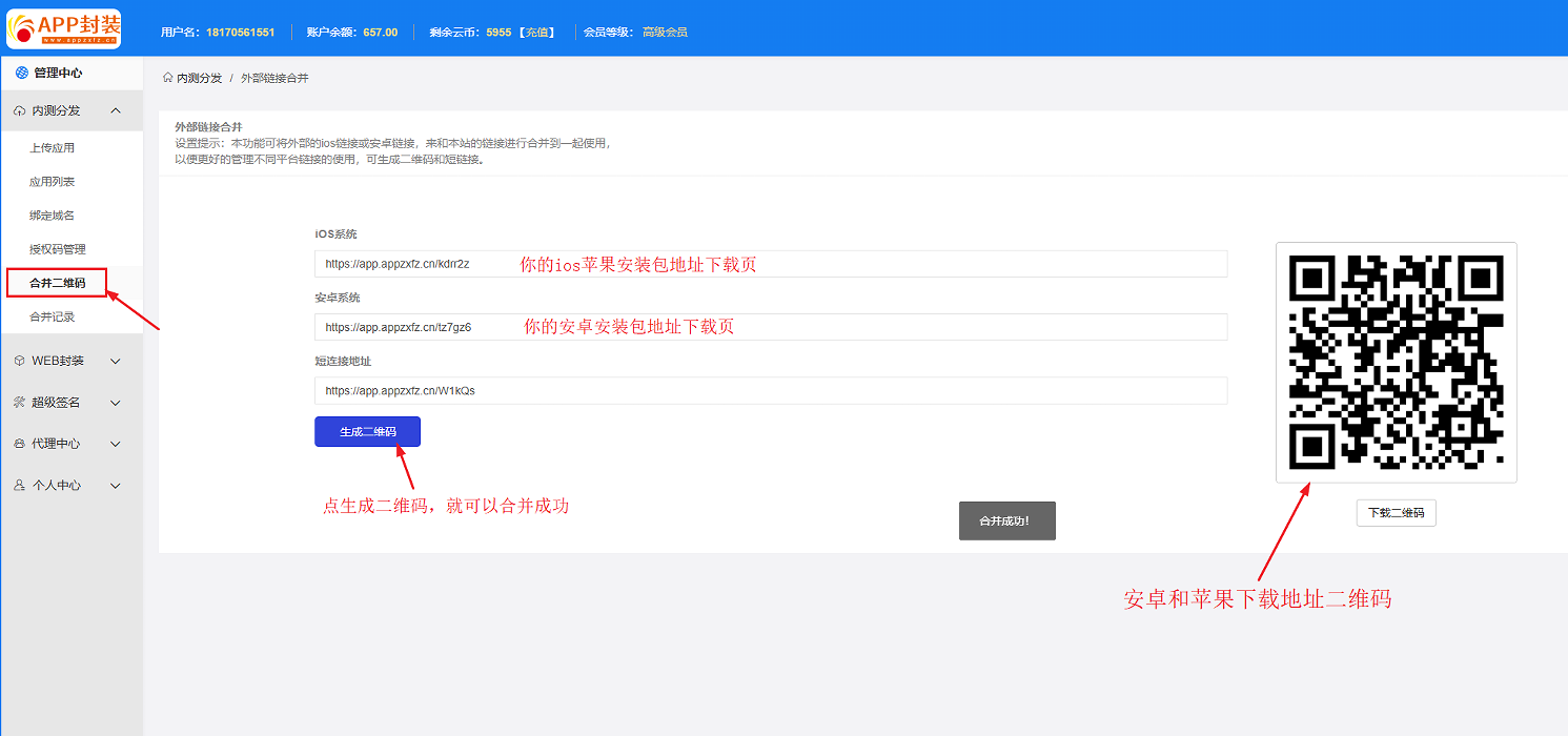 APP封装分发平台支持安卓包.apk和苹果包.ipa上传发布,同时支持安卓APP和苹果APP合并成同一个链接,同一个二维码。
