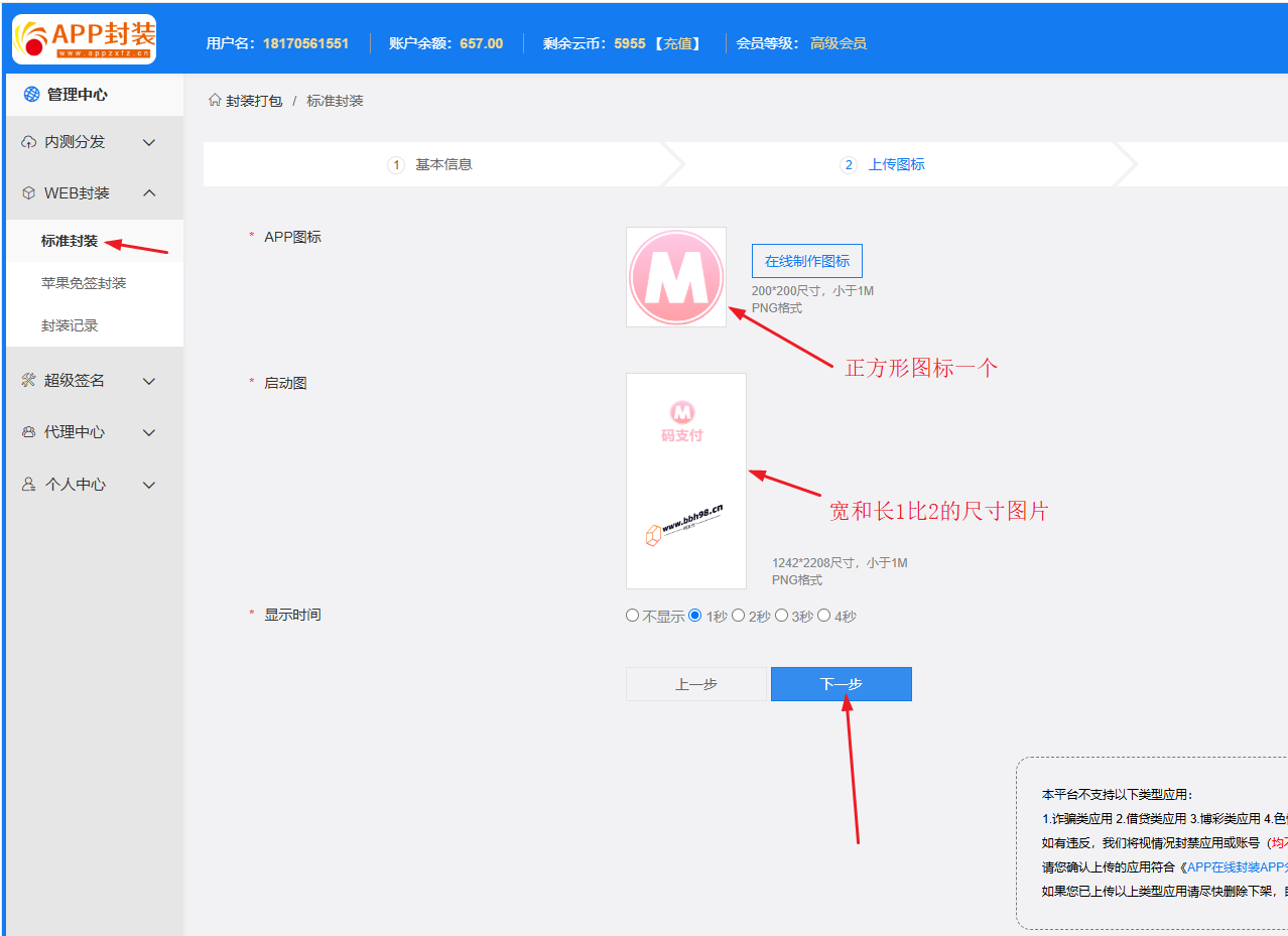 2、按要求填入你的APP名称--你的网址--包名和版本号不填就是默认--选择有效期--下一步