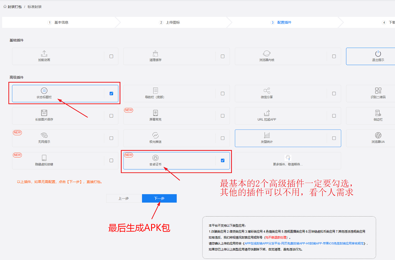 4、高级插件选状态标题栏和安卓证书---最后下一步封装APK